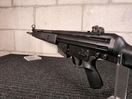 A long barrel front provides a landing area for the auxiliary hand below the barrel, which protrudes a short distance in front of the assembly. The weapon uses the traditional HK selector switch near the shooter's thumb, which is color-coded for quick identification.